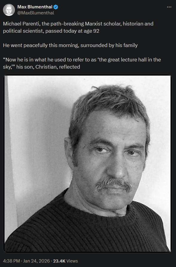 arrow-up110arrow-down1imageMichael Parenti has died at 92.plus-squarenews.abolish.capitalRedWizard@news.abolish.capitalM · 5 hours agomessage-square0linkfedilink