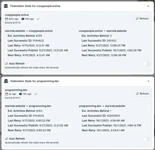 arrow-up11arrow-down1imageOutbound federation to crazypeople.online and programming.dev seems to have stopped?plus-squarestartrek.websiteIced Raktajino@startrek.websiteEnglish · edit-23 months agomessage-square0linkfedilink