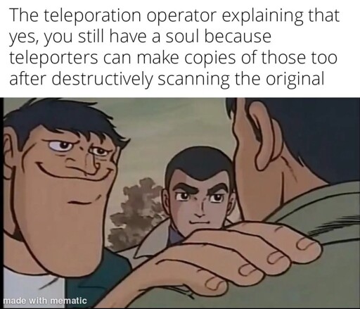 I’ve thought about this for over 25 years at this point. Ever since the first journeyman project game and moment where you teleport to work and it’s like you die, then come back to life, because that’s the only way it could ever work. Unless there’s some weird physics shit I don’t understand where you like slip through a wormhole or something. I don’t know I suck at that kind of physics