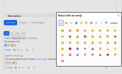 PieFed v1.4 (to be released very soon) will have emoji reactions on posts and comments. An emoji reaction can be a unicode character like 😍 or a colon-delineated string like :piefed: which gets automatically converted into an image when the post/comment is displayed.