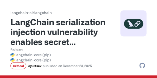 arrow-up15arrow-down1external-linkLangChain serialization injection vulnerability enables secret extraction in dumps/loads APIsgithub.comdigicat@infosec.pubM to blueteamsec@infosec.pubEnglish · 6 days agomessage-square0linkfedilink