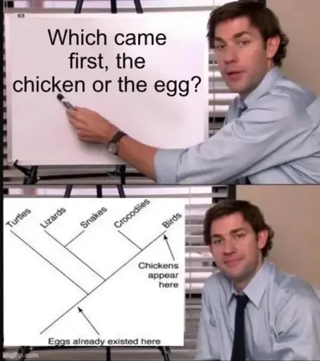 arrow-up1498arrow-down1imageBut the question is, is a chicken egg an egg containing a chicken or an egg which was laid by a chicken?lemmy.dbzer0.comSnokenKeekaGuard@lemmy.dbzer0.comM to Anti Meme@sopuli.xyz · 1 month agomessage-square50linkfedilink