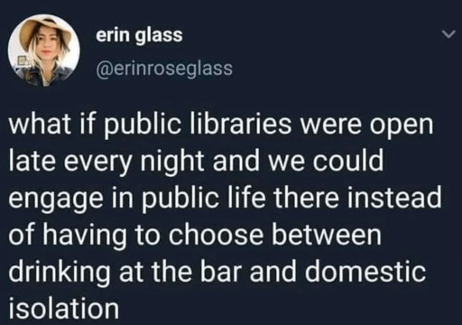 What I’m saying is we need safe warm places for the homeless AND libraries to be open late.