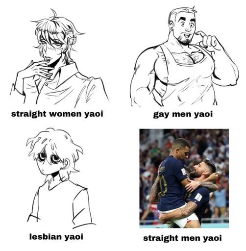 Honestly the real solution to my curiosity would probably be for me to read a bunch of yaoi and compare, but idk if I’m invested enough for that lol. Plus how am I to know if the yaoi is straight-woman yaoi or gay-man yaoi or lesbian yaoi? (If the meme is accurate I get the feeling I’d dislike straight-women yaoi just for the art style alone, and that would greatly bias my data towards the gay kinds of yaoi lol)