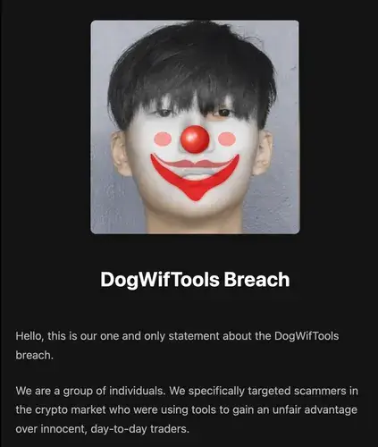 www.web3isgoinggreat.comA suite of software tools called DogWifTools was popular among memecoin creators looking to rug pull unsuspecting traders. By helping token creators mask supply control and fake trading activity, the tool was used to convince outside traders that a token had potential — at least, up until the token creator pulled the rug out from under them.However, poor security by the software developers allowed attackers to ship a remote access trojan (RAT) along with the DogWifTools release. Once the package was downloaded, the trojan began scanning infected devices for crypto private keys, login information, and other sensitive data. Attackers even used scans of identification documents taken from their targets' computers to create Binance accounts.Ultimately, around $10 million was stolen from would-be scammers. Along with the virus, the people who compromised DogWifTools left an angry note on infected machines: "Solana is a fucking joke and a scam from the beginning, it was designed for criminals by criminals! As a result, we have confiscated all your crypto, because you deserved it! You people who use automated tools to run these scam tokens are fucking disgusting to us. It's about time you got fucked over for once. Solana is nothing more than a shitty platform that enables scammers and rug pullers to steal from innocent users."They also launched an onion website containing a message: "We specifically targeted scammers in the crypto market who were using tools to gain an unfair advantage over innocent, day-to-day traders. ... We believe it was morally correct to confiscate money that was not rightfully theirs." They added that they would soon be publishing the user data they stole on the scammers.