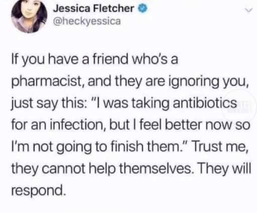 ickplant@lemmy.world to Science Memes@mander.xyzEnglish · 12 days agoLife pro tip for friends of pharmacistslemmy.worldimagemessage-square175linkfedilinkarrow-up11.23Karrow-down113