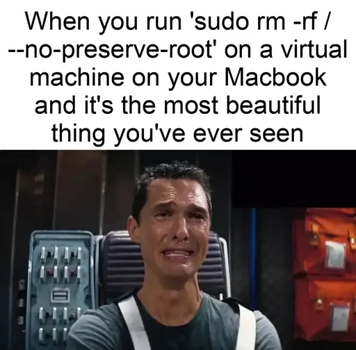 sudoand it just kept saying “can’t remove root”. i’m using UTM on macOS tahoeyou can maybe use strace to find where this text is coming from, btw.