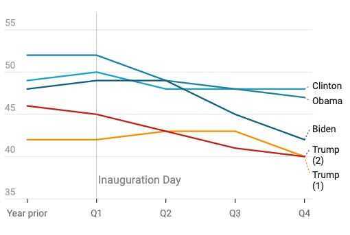 In the first year of Donald Trump’s first term as president in 2017, the share of Americans calling themselves Republicans (or independents who leaned toward the Republican Party) dropped just 2 percentage points — from 42% in 2016 to 40% by Q4 of 2017. I predict it will surprise many people to hear that the Democrats didn’t actually change their advantage in party ID much at all in Trump’s first term, expanding their advantage to +7 in 2018 from +6 in 2016.