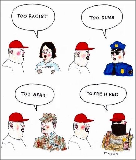 And before you read that as incitement of ICE policy, you might want to consider how prior iterations of mass incarceration and functional red-lining of professional accreditation might be contributing to a modern era of radicalizing the lumpen proletariat into the fascist labor force.