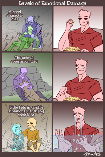 For me, the last one to trigger me this way was the dieing couple in last of us… Which category does that fall in?