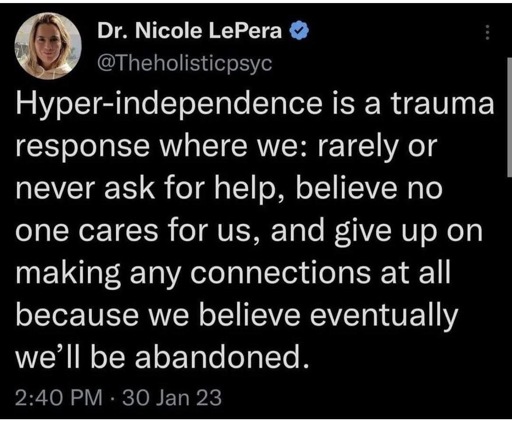 I don’t disagree that it’s a trauma response, but not always to abandonment (I wish), but often necessity. When you have to do everything, you learn how to do everything, and eventually there’s not much left to rely on other people for.