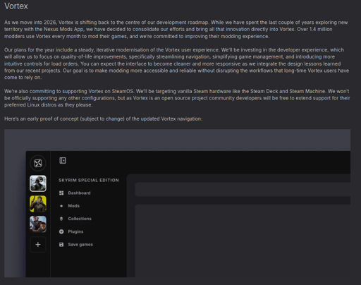 https://www.nexusmods.com/news/15433 As we move into 2026, Vortex is shifting back to the centre of our development roadmap. While we have spent the last couple of years exploring new territory with the Nexus Mods App, we have decided to consolidate our efforts and bring all that innovation directly into Vortex. Over 1.4 million modders use Vortex every month to mod their games, and we’re committed to improving their modding experience.