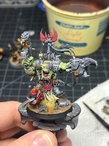 I’ve had this guy kicking around in my backlog for years and decided he’d be a good candidate for an Orksperiment. I wanted to see how well I could do using mostly contrast/speed paints. The only traditional paint is the undercoat, the red for the symbols, and a bright metallic dry brush over the metals. I’m really happy with how this turned out!