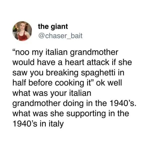 Ffs… thinking a dish is “ruined” because someone Broke the spaghetti. LMAO!