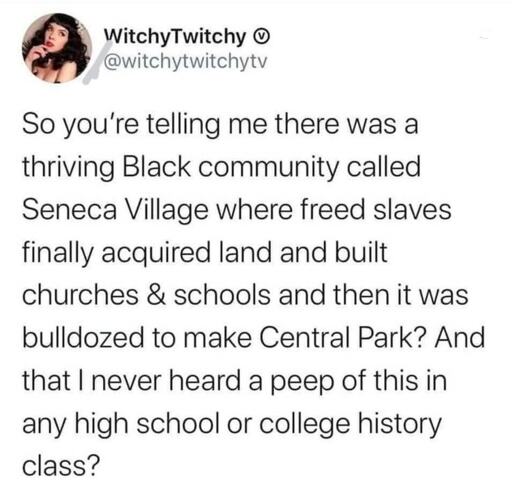 (Concretely for NYC and every city in the US, a good start would be superblocks. Though Manhattan should probably go car-free and rely entirely on public transit. That way every street can be converted into greenery, and you don’t need to go to Central park to sit under a tree and enjoy the sounds of birds and of children playing. Restorative justice for Seneca village probably wouldn’t involve sweeping changes to Central Park - the descendants have built lives elsewhere - but that’s for the descendants, the people of New York, and for white and black USAmericans in general to reckon with).