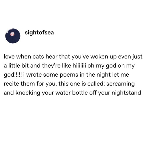 If I so much as shift in my sleep my cat creeps up as silently as she can so as not to wake me, sticks her face up against my ear, and then shrieks as loudly as she can. This usually happens shortly after I finally manage to fall asleep.