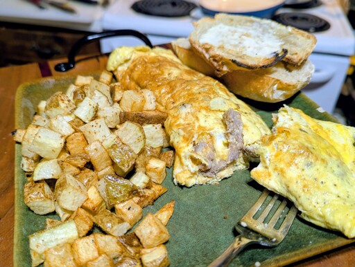 The steak was free. But for the first time in 8 years I had to buy eggs. Cost per person: $2 Cost if you had to buy the steak, $6. Cost if my hens were laying: $1.50.