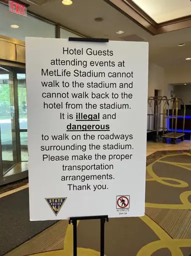 One of them links to a really good New York Times article from 2013 about this exact problem. You genuinely cannot comply with New Jersey traffic laws – reasonable ones that keep you safe – and walk to the stadium on foot.