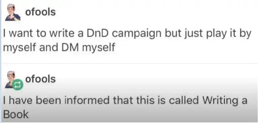 minus-square5too@lemmy.worldlinkfedilinkEnglisharrow-up5·1 month agoYep, this is the post I was looking for. Writing a book means planning out plot and character arcs and going back to edit and such. Solo RPGs are an entirely different beast. They can inspire books, but they are not an authorial exercise.