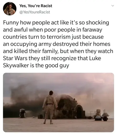 There’s a reason you’re using the word terrorist instead of Rebel or Imperial, now isn’t that weird? Why separate them if they aren’t different…?