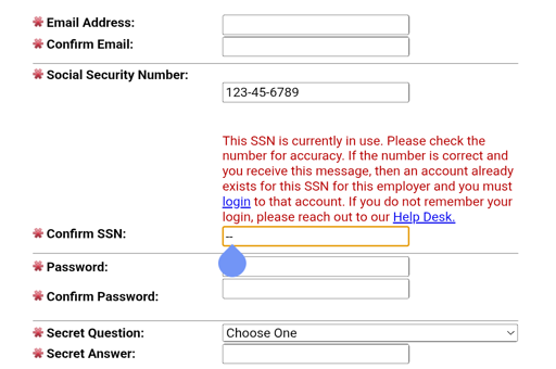 On a job application site for my local government it reveals if a specific social security has been used or not on that site. The site is very outdated.