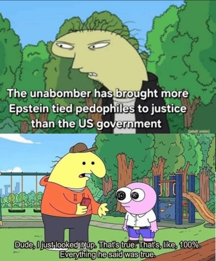 minus-squareFiniteBanjo@feddit.onlinelinkfedilinkEnglisharrow-up5·edit-21 month agoThat’s why we’re here, a dude who got bombed in 1995 turned up in the files a bunch of years later. Given the other people Ted bombed it probably had more to do with working at a Uni than being part of some pedo ring.