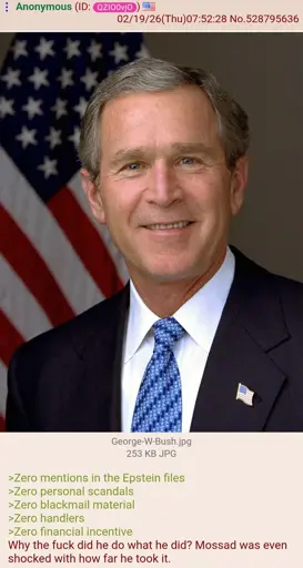 W apologia is still fucking W apologia. Everyone started reminiscing on him for some reason after Trump’s first election and it made me want to puke. It’d be what, nearly a million dead Iraqis because of his bullshit? Nah, I’m going to get angry when people start making light of his war crimes and say untrue things like he had no financial stake in it.