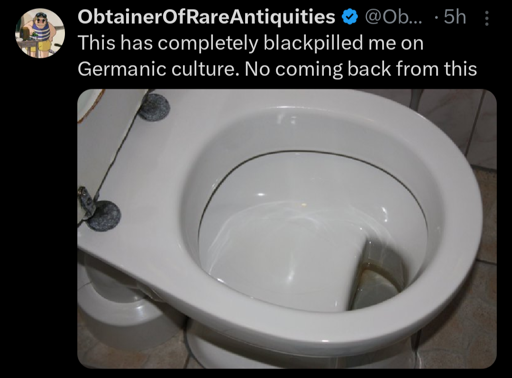 In a traditional German toilet, the hole into which shit disappears after we flush is right at the front, so that shit is first laid out for us to sniff and inspect for traces of illness. In the typical French toilet, on the contrary, the hole is at the back, i.e. shit is supposed to disappear as quickly as possible. Finally, the American (Anglo-Saxon) toilet presents a synthesis, a mediation between these opposites: the toilet basin is full of water, so that the shit floats in it, visible, but not to be inspected. […] It is clear that none of these versions can be accounted for in purely utilitarian terms: each involves a certain ideological perception of how the subject should relate to excrement. Hegel was among the first to see in the geographical triad of Germany, France and England an expression of three different existential attitudes: reflective thoroughness (German), revolutionary hastiness (French), utilitarian pragmatism (English). In political terms, this triad can be read as German conservatism, French revolutionary radicalism and English liberalism. […] The point about toilets is that they enable us not only to discern this triad in the most intimate domain, but also to identify its underlying mechanism in the three different attitudes towards excremental excess: an ambiguous contemplative fascination; a wish to get rid of it as fast as possible; a pragmatic decision to treat it as ordinary and dispose of it in an appropriate way. It is easy for an academic at a round table to claim that we live in a post-ideological universe, but the moment he visits the lavatory after the heated discussion, he is again knee-deep in ideology.