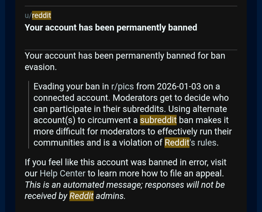 No warning, not even a “Don’t do it again email” - I had a work account, that was logged in on my works laptop, I made a comment critical of Netanyahu, and the Gaza genocide, which got that account banned from /pics. This was months ago, then I made a comment on pics, on my main account. That’s it, gone, banned.