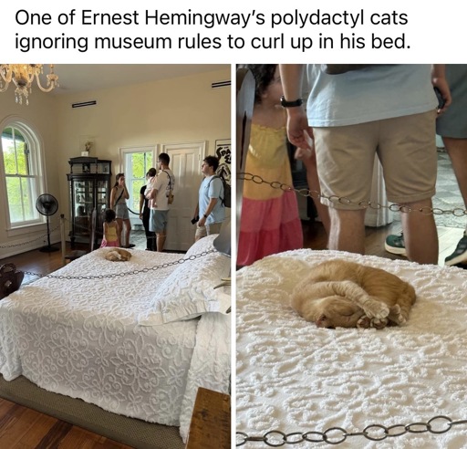 This sent me down a rabbit hole where I learned PETA investigated the house. According to Wikipedia, even PETA said “What I found was a bunch of fat, happy and relaxed cats.” https://en.wikipedia.org/wiki/Ernest_Hemingway_House