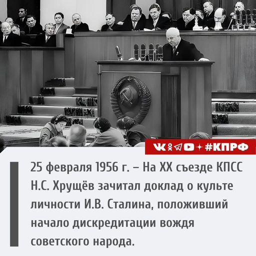 On February 14, 1956, the XX Congress of the CPSU began its work. The key event of the congress was Nikita Sergeyevich Khrushchev’s report “On the Personality Cult and Its Consequences”, which was read at the morning session on February 25, 1956. The report was prepared on the orders of Nikita Khrushchev by a special commission led by Pyotr Pospelov with the aim of discrediting the leader of the Soviet people, Joseph Vissarionovich Stalin.