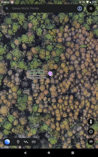 Walt Disney World Resort is obviously a pretty large area, so you’d think that Google Earth ought to recognize that and automatically zoom out a bit to show the whole area, not just a pinpoint out in the sticks…