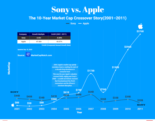 Jimmy@mander.xyz to Data is Beautiful@mander.xyzEnglish · 27 days agoSony vs. Apple -- The 10-Year Market Cap Crossover Story(2001–2011)mander.xyzimagemessage-square0linkfedilinkarrow-up121arrow-down12file-text