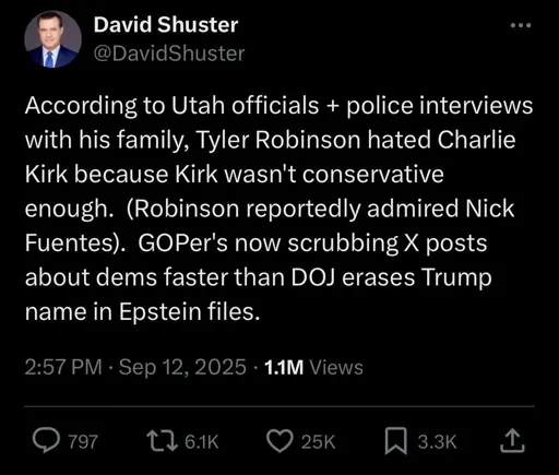 favoredponcho@lemmy.zip to People Twitter@sh.itjust.works · 17 days agoCharlie Kirk was killed by a groyperlemmy.zipimagemessage-square312linkfedilinkarrow-up11.56Karrow-down132