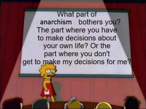I’m ready to admit this is less free for those local societies than if they could pollute everyone into extinction. Anarchism isn’t about perfect freedom, it’s about abolishing hierarchy. You will attend the weekly meetings and you will help the community make informed decisions. You will avoid causing harm and you will avoid violating consent. Not because someone told you to, but because “everyone” told you to. Horizontal accountability, and horizontal enforcement if necessary.