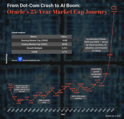 Starting at $163B in 2000, Oracle’s market cap was halved by the dot‑com crash, bottoming near $57B in 2002. The company rebuilt through the mid‑2000s, only to face another dip during the 2008 financial crisis. Its 2015–2018 cloud pivot laid the groundwork for renewed growth, but the real inflection came post‑2020 — fueled by cloud infrastructure dominance, database leadership, and the AI wave — propelling Oracle to $865B by 2025.