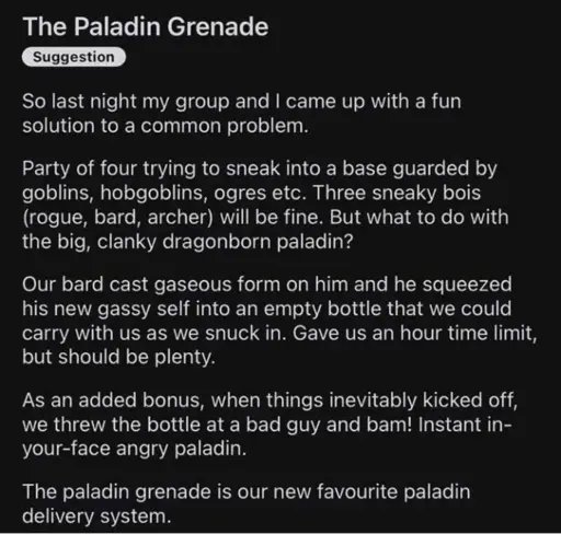 I’m part of a Western Reaches campaign where I’ve got an entire party worth of characters to pick from. In here are two with the Fey Touched feat, giving them the spell Misty Step, this being a warlock and a paladin. While the former would use that to get out of hairy situations, the latter would use it to get into them.