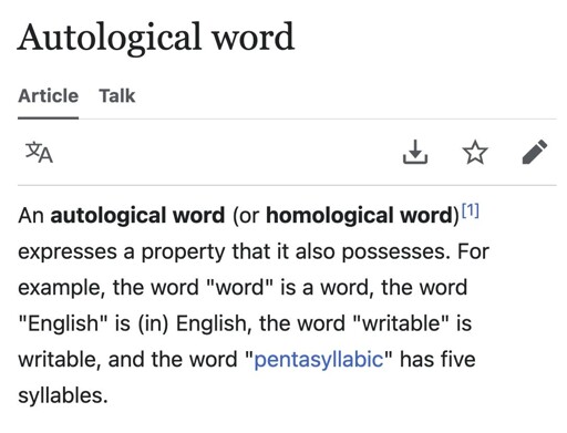 minus-squareblujan@sopuli.xyzlinkfedilinkarrow-up1·3 days agoNone, we assumed the classification was binary, but these words are called Grellingian Words