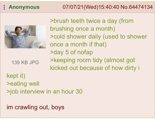 I had no idea that nofap was what you just described. I saw the green text as the person taking all those positives steps to get back to living life and not some Andrew Tate thing.