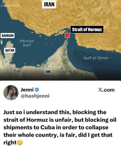 Also, I legitimately think that there is no hypocrisy about the U.S being upset about Hormuz closure while also pursuing the Cuba cutoffs. It’s a stupid and bad strategy but it’s not hypocritical. Because it’s not hypocritical, in my opinion, the two topics shouldn’t even be addressed in the same breath, because then it seems like I’m trying to equate them when they really don’t deserve to be equated. I think most right-wingers are proud to say something like “It’s fine when I do X but not fine when you do X, because I’m good so I deserve it, and you’re bad so you don’t deserve it”. And to be honest, I actually really like this mentality and I think the left could use more if it. We get glimmers of this great mentality when we say things like “It’s okay for me to kill a Nazi but it’s not okay for Nazis to kill me, because Nazis are evil and I am not”. So let’s just own up to this - really, EVERYONE is looking out for themselves, and even when we cooperate with people, it’s either because we truly just love them and want what’s best for them, or it’s because we expect it to be mutually beneficial. I would start by paying homage to this, to establish with them that I share an axiom of theirs: “WE should do what’s best for US”. But this is purely rhetorical and not strictly logically necessary. But it’s not logically flawed either which is what I really care about preserving.