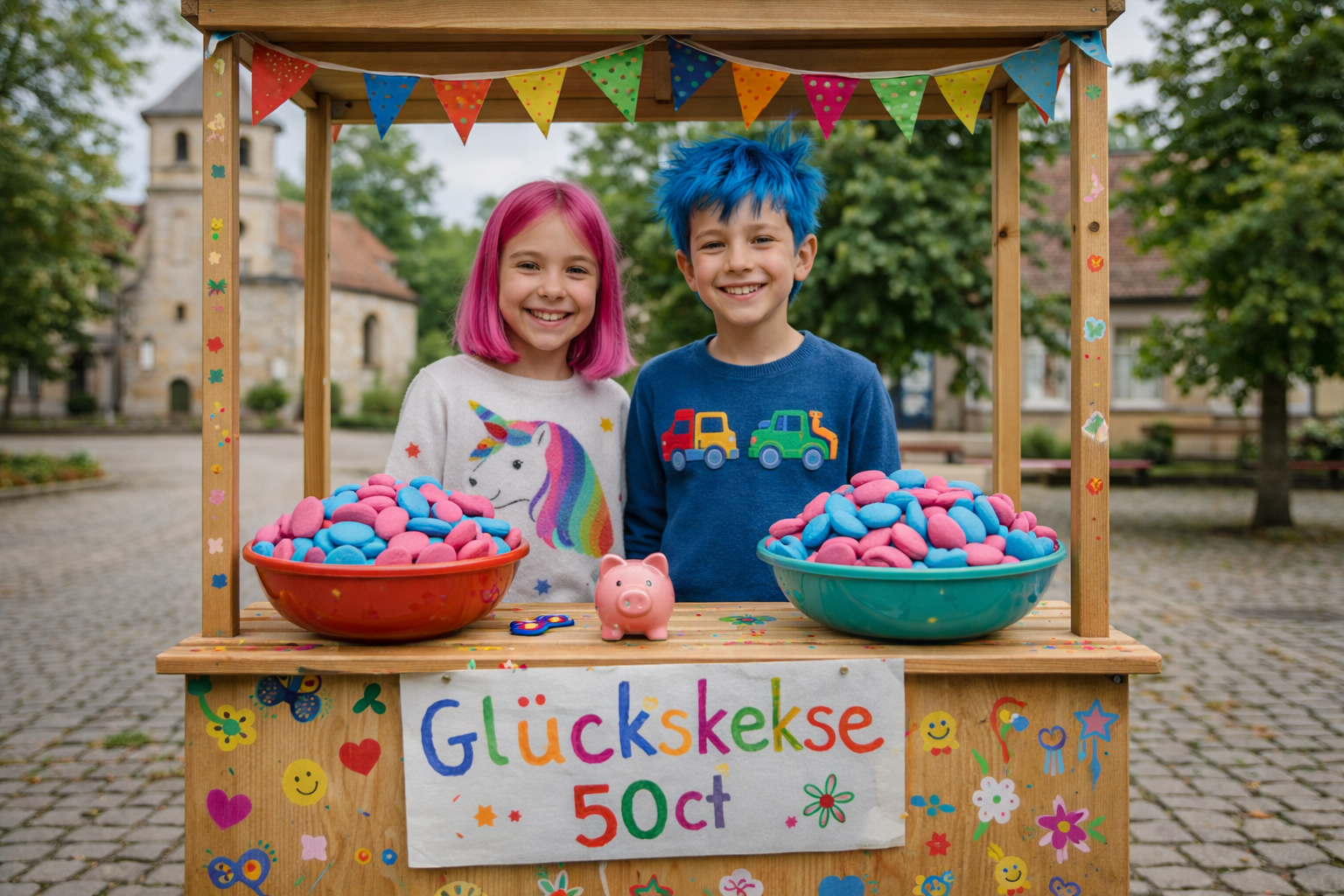 Ella und Luis stehen auf dem Dorfplatz und verkaufen Glückskekse. Ella möchte von dem Geld alle Bonbons aus dem Dorfladen kaufen.