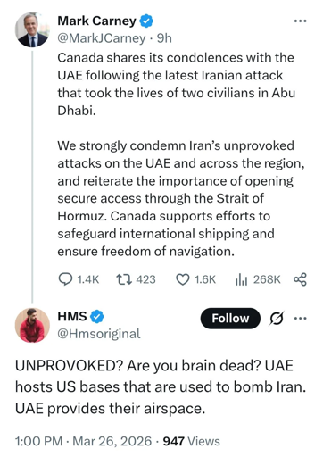 Thanks to Trump’s economic policies Canada has been forced to diversify its economic partners. This has included investment with the UAE. The CBC reported in Nov 2025 that the UAE to invest 70 billion with Canada. So he has to show to be supportive of his new partners.