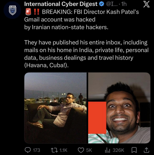 powerstruggle@sh.itjust.worksM to stupidpol@sh.itjust.works · 5 days agoFBI Director Kash Patel's Gmail account was leaked by Iranian hackers. His personal photos and emails are currently being circulated online.sh.itjust.worksimagemessage-square27linkfedilinkarrow-up1312arrow-down14file-text