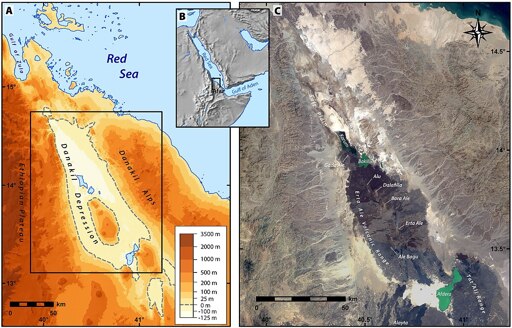 It features several endorheic and saline lakes, such as Lake Afdera, Lake Karum, and Lake Bakili that sit on volcano-tectonic depressions.
