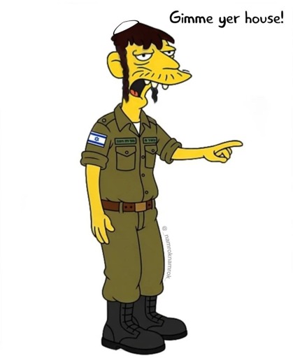 A lot of the IOF murderers have a yarmulke, payot and are anti-intellectual reactionary idiots like cleetus from the simpsons, the character the OP is based on.