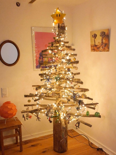 Ich habe vor einigen Jahren im Sommer trockenes Totholz gesammelt, dann die Äste zugeschnitten, je ein Loch in die Mitte gebohrt und auf eine Metallstange (Betonstahl) gesteckt, die wiederum eine Bohrerlänge tief im Stamm steckt. Das machen wir jetzt schon seit einigen Jahren so. Wenn die Feiertage vorbei sind kommen die Einzelteile in einem großen Kaffeesack aus Jute zurück auf den Speicher. Wir mögen den Baum richtig gerne, er hat nichts gekostet und das jährliche auf- und abbauen mit den Kindern ist ein schönes Ritual. :)