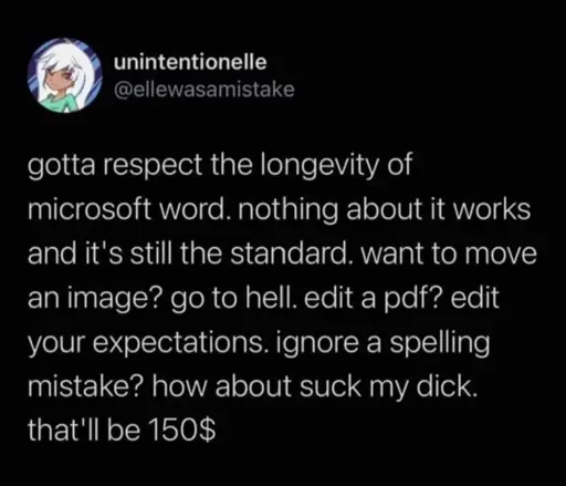MS spent a ton of time and resources breaking standards just to force people to use their product. Excuse me if that makes me dislike them. I don’t hate them because I have trouble formatting documents (although image manipulation in word is absolutely ass to this day).