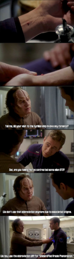 I found the use of bacon/cheese/animal products a little un-Trek-like in this episode. Comments against veganism felt a little weird in an era of food synthesizers and the general vision of “we don’t enslave animals for food.” It’s not like vegan food is disgusting. Spock confirmed humans still eat inordinate amounts of cheese and meat with implications that it’s often to the point that it’s unhealthy. Is it still illogical to have some animal protein if it’s problems regarding ecological efficiency are a solved issue (beyond the saturated fat and caloric arguments)? IDK, something felt off.