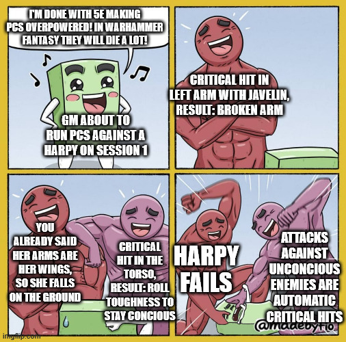 RPGMemes @ttrpg.network•Not counting character creation or session zero of course, first actual gameplay session
